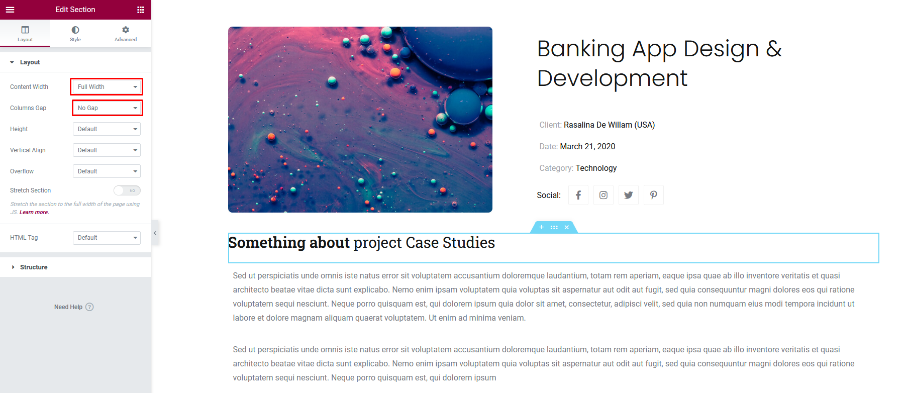 Add a section with "full width" and "No